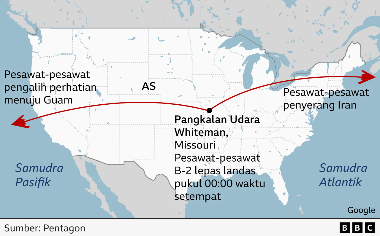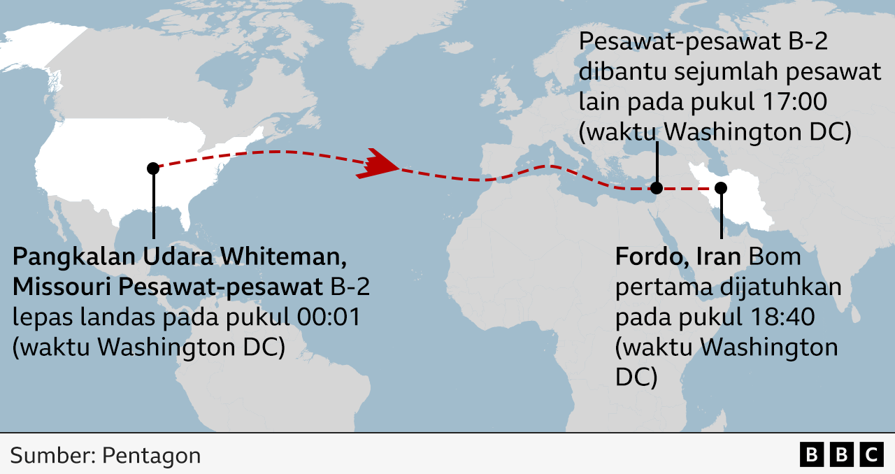 Ketua Kepala Staf Gabungan militer AS, Jenderal Dan Caine, mengklaim serangan terhadap fasilitas nuklir Iran meliputi penerbangan selama 18 jam sekali jalan, sejumlah pengisian bahan bakar di udara, dan serangkaian penerbangan pengecoh.