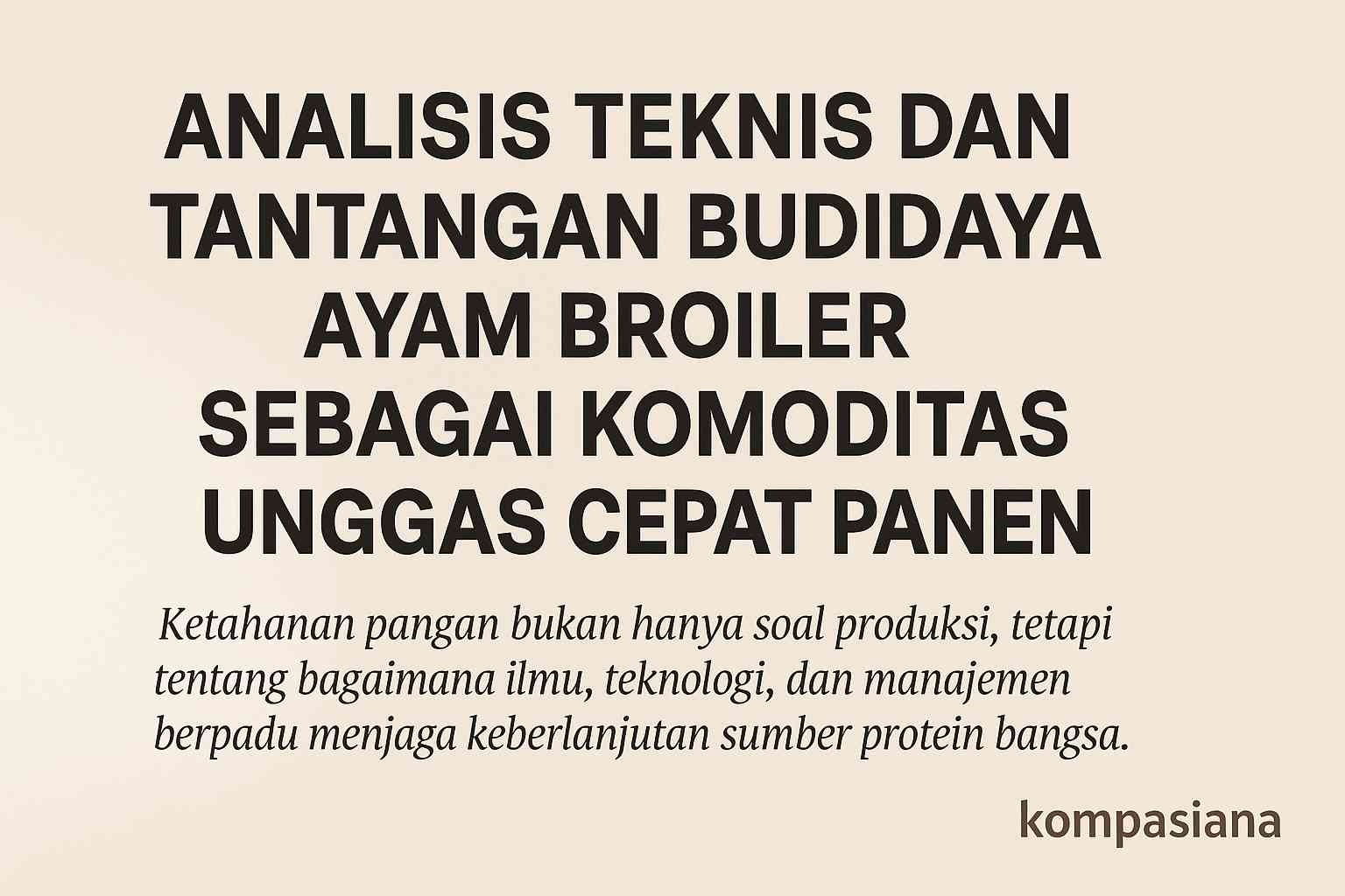 Budidaya ayam broiler merupakan usaha peternakan yang menjanjikan, namun memerlukan manajemen teknis dan kesehatan yang ketat. Tantangan seperti penyakit, perubahan suhu, dan isu kesejahteraan hewan harus diantisipasi melalui penerapan teknologi modern, manajemen nutrisi yang baik, dan sistem biosekuriti yang terstruktur. Dengan pendekatan ilmiah dan adaptasi teknologi yang tepat, sektor broiler dapat terus berkembang sebagai pilar utama penyediaan protein hewani nasional.